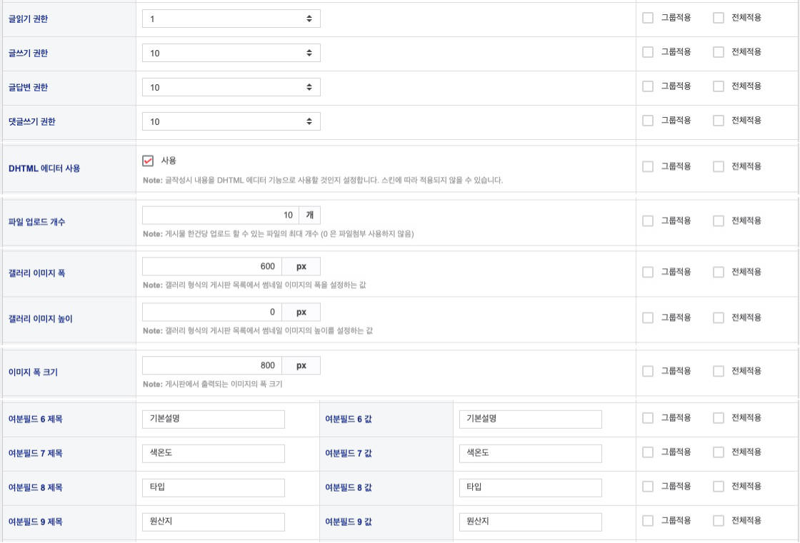 게시판 추가 설정(관리자 - 테마설정관리 - 게시판 추가설정)