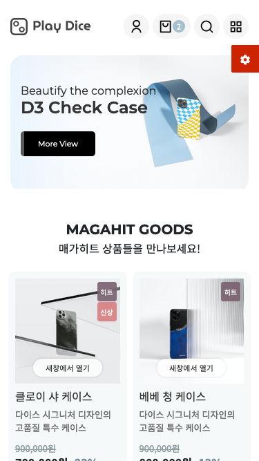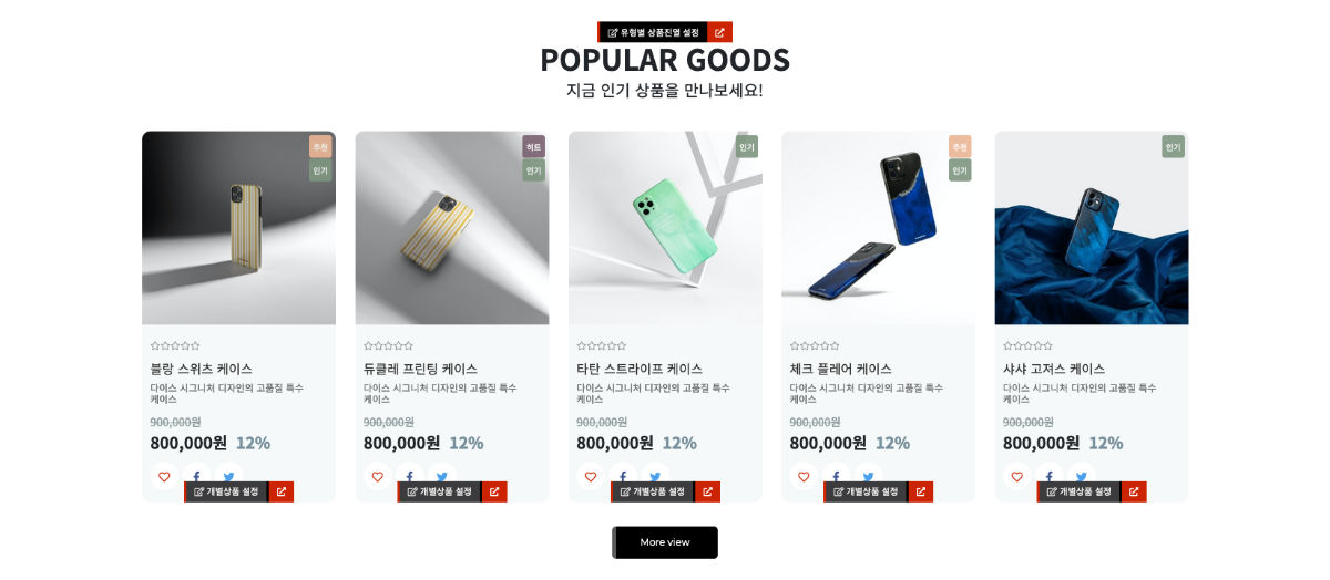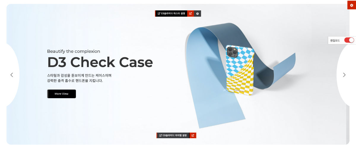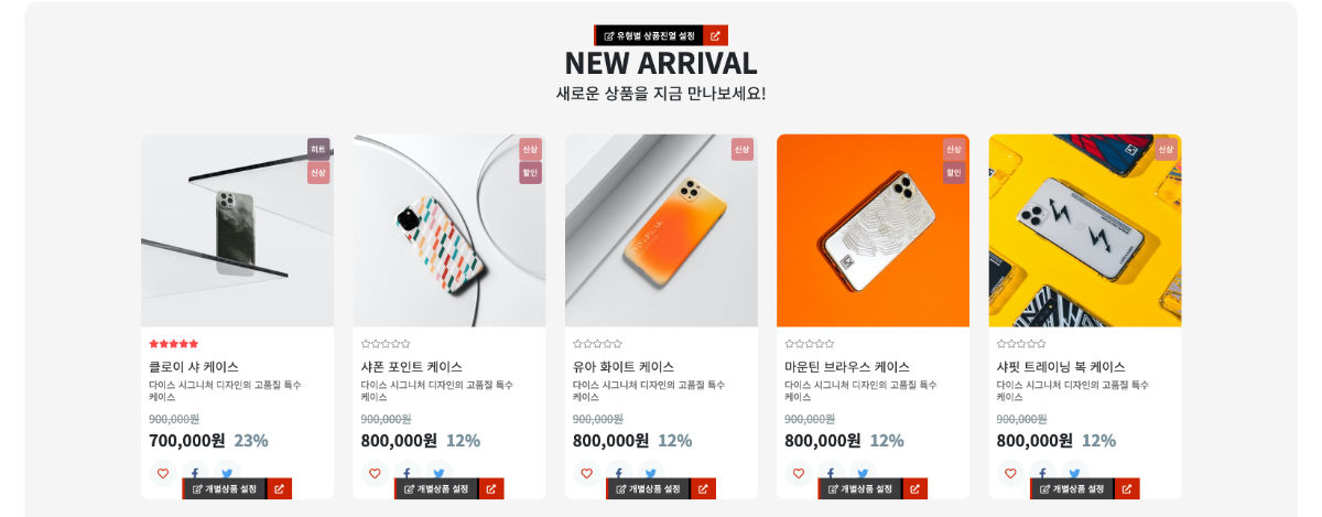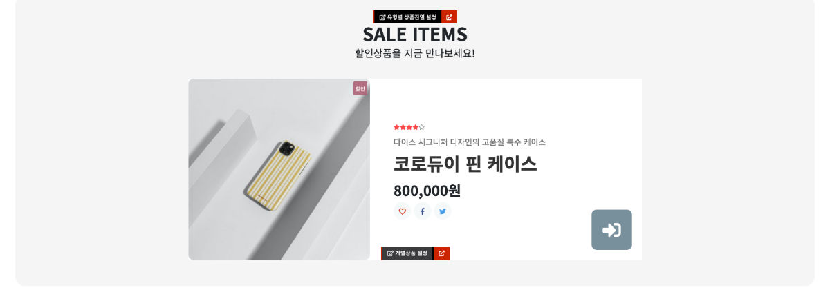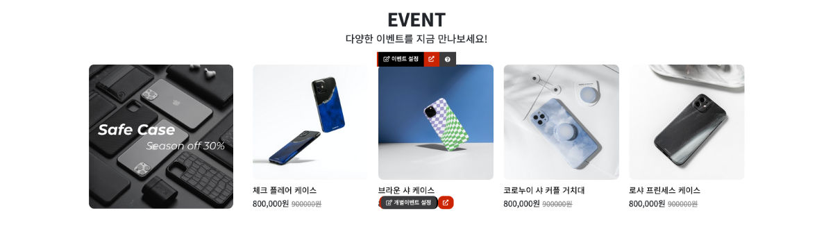 - 메인에서 편집모드를 통해 내용 및 이미지 수정이 가능하며 상품 등록 후에도 개별상품 설정이 가능합니다.