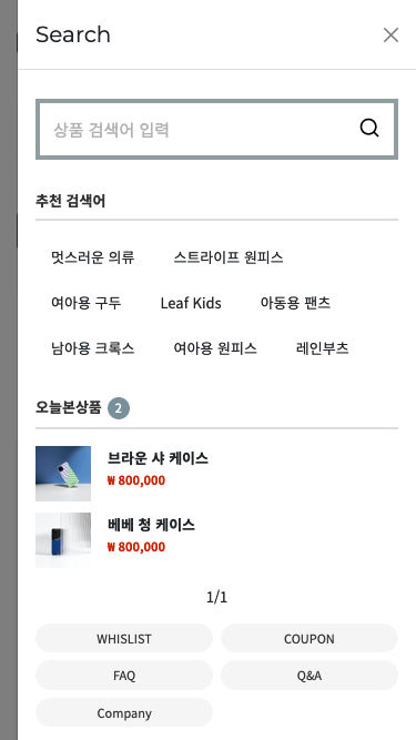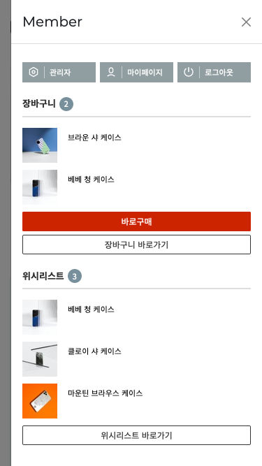 - · 로그인 후 아이콘 클릭시 창으로 오늘본상품, 장바구니, 위시리스트를 확인 할 수 있습니다.