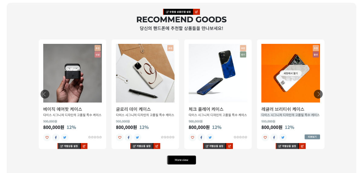 - 설치시 상품 등록은 지원하지 않기에 데모사이트와 같이 상품 출력 된 레이아웃은 출력되지 않습니다.(직접 관리자모드에서 상품 입력 해야합니다.)