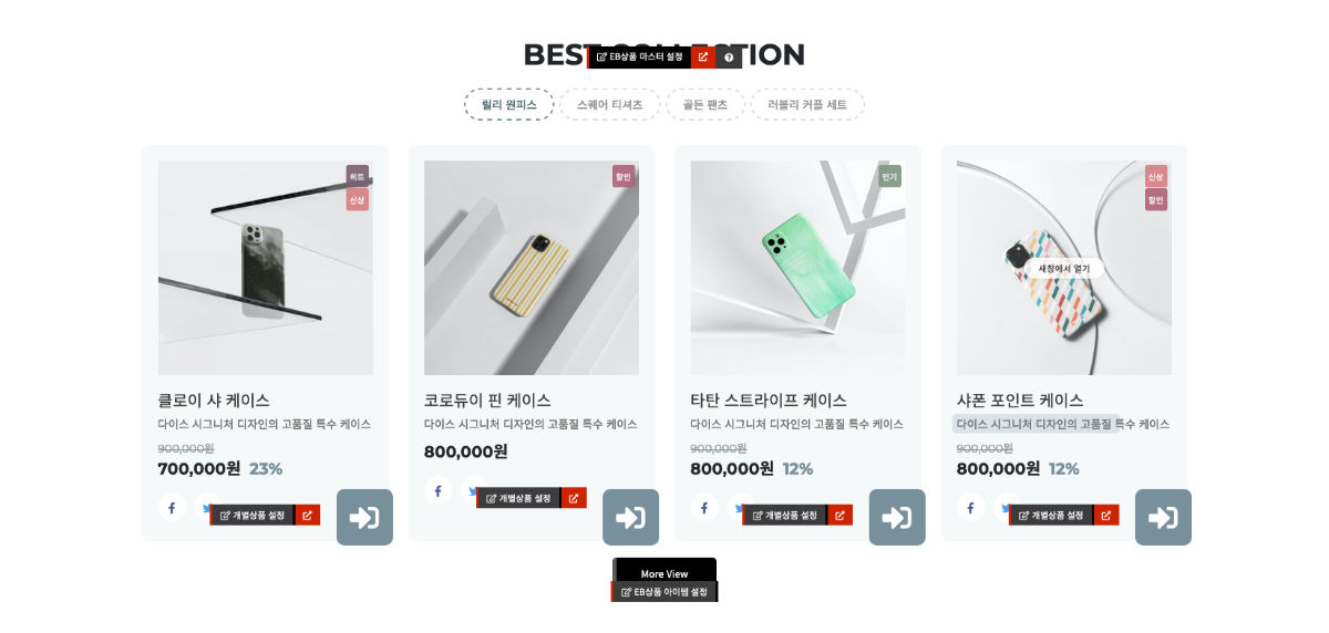 - · 이윰빌더에서 제공하는 분류(카테고리) 상품 출력 스킨입니다.('관리자 - 테마설정관리 - EB상품추출관리'에서 설정)